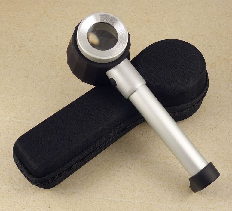 The magnifier comes in a padded, fitted zipper case as shown, and I’ll throw in the batteries — good ones — so you can get started as soon as you receive it.