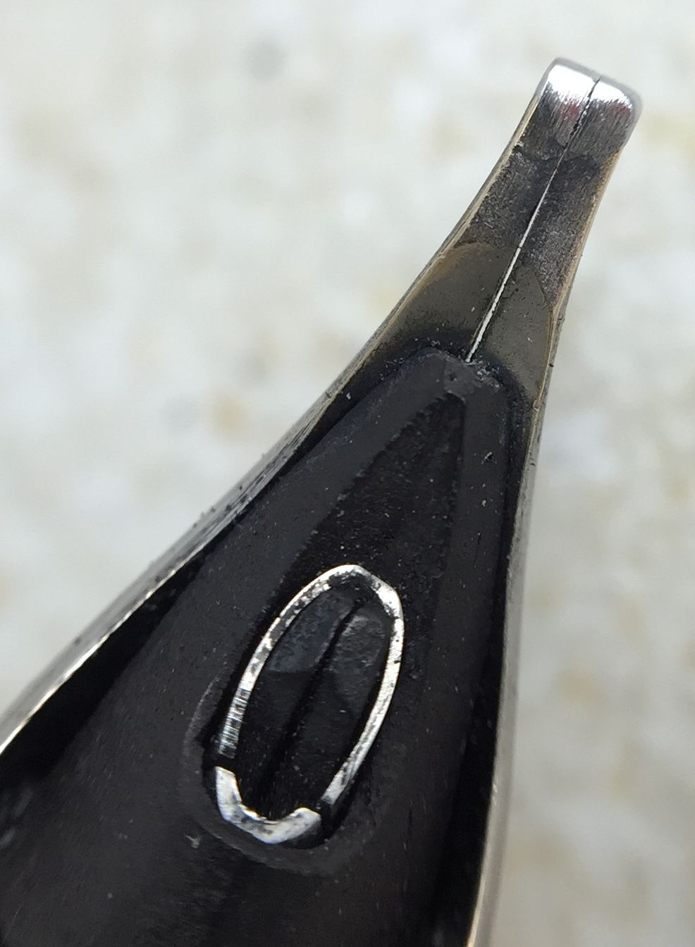 The magnifier is well-constructed of aluminum, with screw joints, not mere press-fit construction, and the lens provides about 8X magnification. The handle contains a pair of AA batteries which power not one but three white LEDs to give bright, even lighting of the subject, which is particularly useful in those dark and dusty antique stores (and at some pen shows!). The lens assembly has an integral graticule at the focus distance, allowing measurement of details in either millimeters or fractions of an inch — a handy feature when sizing up nibs. And because the focus distance is coplanar with the front of the magnifier, you can simply place it flat on a page to measure the stroke width of a writing sample. The head has a rubberized coating, and I can attest to the fact that the whole unit wears extremely well — I’ve had mine for at least a decade and it looks great and works perfectly.